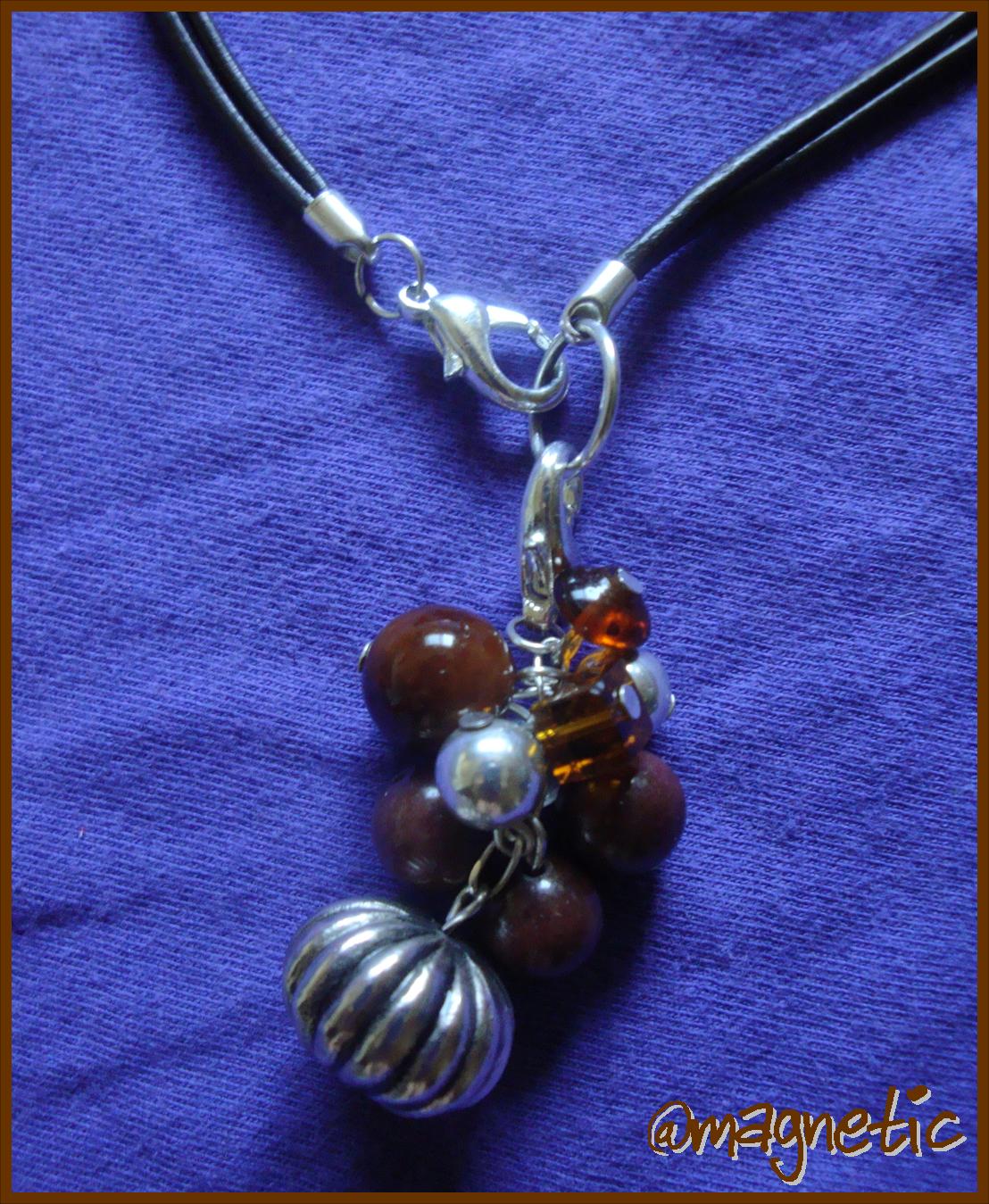 Colgante con bolitas en tonos plata y chocolate. Unido por un mosquetón a un collar corto de cuero en el mismo tono.